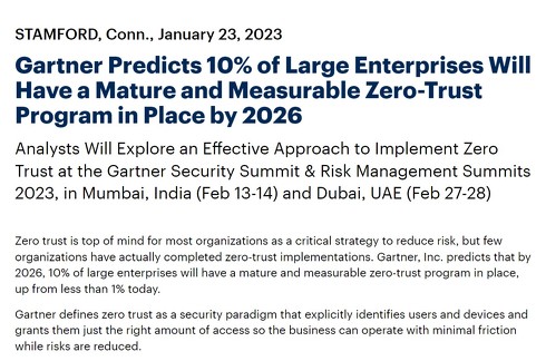 調査会社である米Gartnerが1月に発表したレポートによると、現時点で成熟した実効性のあるゼロトラストプログラムを実装できているのは、大企業でもわずか1%未満。2026年までに実装できる大企業も10%にとどまる見通しだという。