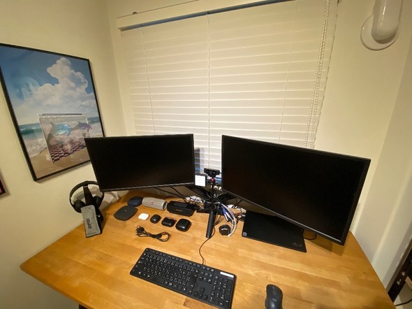 ラップトップと解像度が同じ方が使い勝手が良いので、モニター2台を使ってデュアルモニター化しています。営業職なので打ち合わせが多く、シーンごとに音声ツールを使い分けています。話すことがあまりない会議はマイク付きのスピーカー、たまに話す場合はワイヤレスイヤフォン、プレゼンなどをする場合は安定性を優先して有線のヘッドセットを仕様しています。