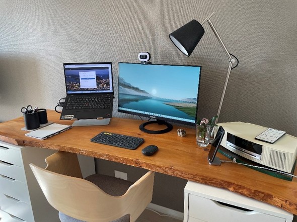 なるべく物は少なくすっきりとしたデスク回りを心掛けています。PCと画面の高さを合わせて、姿勢よく、Web会議でもちゃんと相手の顔をみて話せるようにしています。