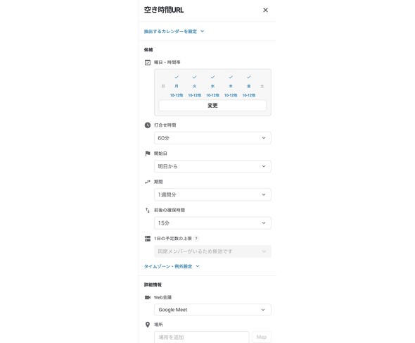 それに加えて、候補日程を提示する側にも非常に細かい調整が可能になっている点が支持されている。ミーティングとミーティングの間を何分取るのか、1日に何件までアポイントを入れるのか、会社のカレンダーの他に個人のカレンダーも連携させるか、などやろうと思えばかなり細かいチューニングができる。また祝日については、日本の祝日の他に中国や韓国、米国、カナダなどの主要国の祝日を候補日から除外する設定が可能だ。