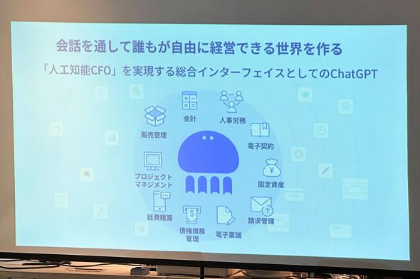 クラゲは副店長として、経営面のアドバイスもしてくれる。今はChatGPTにありがちな「イベントをしてみましょう」などの一般的な施策を答えてくれるが、より高度な経営サポートを実現すべく、会計、販売管理、経費精算、人事労務、請求管理、債権債務管理など各プロダクトと連携し、経営状況を分析・改善するfreee独自のAIを開発予定。これをChatGPTと接続することで、自然な会話で経営をサポートする「人工知能CFO」の構築を目指す。実現すれば、freeeユーザーのスモールビジネスをサポートする存在にもなるだろう。