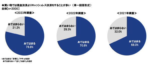 この比率は、2021年調査の68%、22年調査の70.8%から継続して上昇しており、キャッシュレス決済の普及とともに増加している。