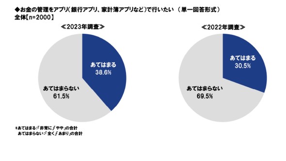 同様に、お金の管理を銀行アプリや会計簿アプリなどで行いたいという人も、38.6%にのぼった。こちらも22年調査の30.5%から8.1ポイント増加した。