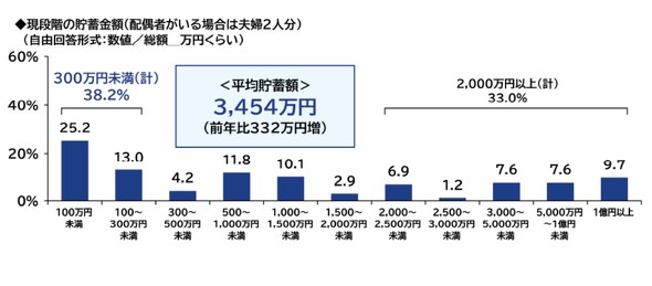 なお、還暦人に貯蓄額を聞いたところ、平均は3454万円となり、22年調査から332万円の大幅増加となった。一方で、約4割が「貯蓄額は300万円未満」、3割以上が「2000万円以上」と答えており、貯蓄格差が際立つ結果となった。