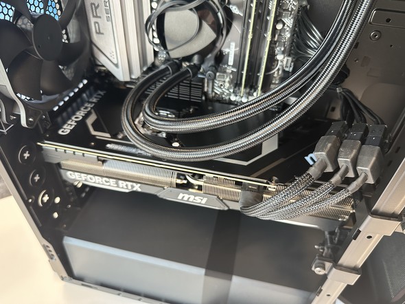 このマシンでは、グラフィックスカードに補助電源のケーブルが3本つながっていますね。もし後から上位のグラフィックスカードに載せ替えることを想定するなら、こうしたケーブルに対応した電源を選ぶ必要があります。