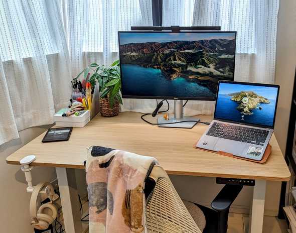 グレア反射ゼロで、モニターに掛けられるライト「ScreenBar」も買いました。画面の明るさを調整して、目の疲れを軽減できます。疲れた時は植物やふわふわのブランケットで憂鬱(ゆううつ)な気分を吹き飛ばします。