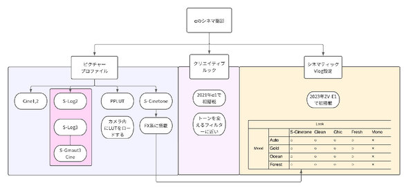 時代が進み、デジタルシネマが次第に映画制作のデファクト化していくと、αも上位CineAltaシリーズのサブカメラとして使えるように、S-Logで撮影できる機能が搭載された。遅れてFXシリーズで人気のあったS-Cinetoneが、αでも同じトーンで撮影できるようにと、この機能も降りてきた。