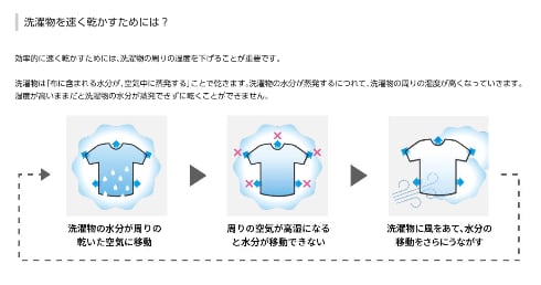 では、部屋干しの時間を短縮するにはどうしたら良いのでしょうか。パナソニックは「洗濯物の周りの湿度を下げることが重要」としています。