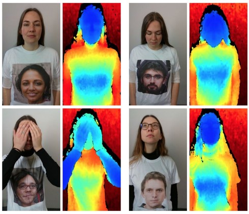このように作った「敵対的Tシャツ」を参加者8人に着用してもらい、1枚のTシャツにつき、8種類のポーズ(上下左右を向く、手で顔を隠す、フェイスマスクを着用など)をとってもらう。撮影は可視光(RGB)と深度データの両方で行う。