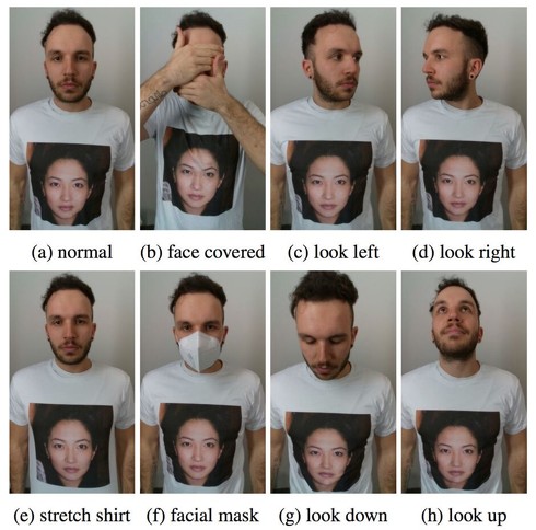 この攻撃を検証するために研究チームは、異なる顔の写真をプリントしたTシャツ100枚を用意する。プリントする顔画像は、画像生成モデル「StyleGAN」でランダムに生成した実在しない顔。顔画像は性別や肌色、年齢をランダムに散らしており、顔の角度や照明も調整されている。