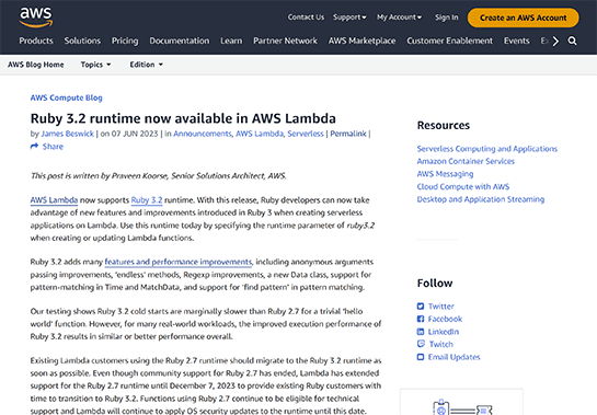 この記事は新野淳一氏のブログ「Publickey」に掲載された「AWS LambdaでRuby 3.2の利用が可能に、初のRuby 3.xサポート。Ruby 2.7のサポートは2023年12月で終了」(2023年6月14日掲載)を、ITmedia NEWS編集部で一部編集し、転載したものです。