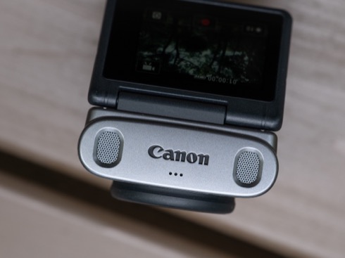 上面にはステレオのマイク。マイクの間にあるCanonのロゴがレトロに感じるのはシルバーにブラックという色の関係か(もちろん他製品とロゴは同じだ)。