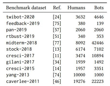 これらの論文にあるほとんどのベンチマークデータセットは、さまざまな文脈で収集されたデータの集合体である。その多くは特定のツイート(特定のハッシュタグを含むツイートなど)で収集され、収集された各ツイートは人によってbotか人間かのラベル付けが手動で行われる。そして、手動でラベル付けされたデータセットを使用し、特定の文脈内でbotや人間を認識するためのモデルの学習を行う。