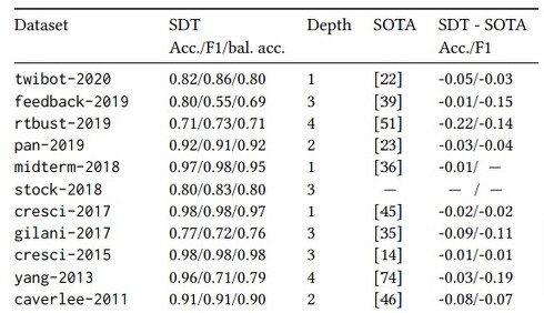 また、多くのデータセットにおいて、比較的シンプルなモデル(例えば、アカウントがどれかのツイートを「いいね」したかどうかを見る)でも、より最先端(SOTA)の機械学習モデルと同様の正確性が得られることを発見した。