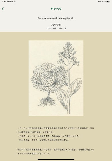 竹内さん:アプリのコンセプトはバラコレと同じです。100個の植物の写真を集めること。牧野100コレの特徴は、牧野富太郎と関わりのある植物を100個、高知県立牧野植物園の先生に選んでいただいたこと、その選定理由もアプリの中に紹介されていること、牧野富太郎らの描いた植物画が掲載されていることです。