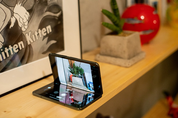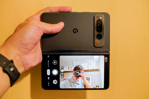 ディスプレイが180度開くヒンジを生かした機能もある。ヒンジでカメラの角度を付けられるので、半折りたたみの状態でテーブルに置けば、簡易三脚のように使うことができる。時間がなくて試せなかったが「天体撮影モード」も使いやすいだろう。さらに、180度開き切ることで、外側ディスプレイをメインカメラの「自撮りプレビュー画面」に使うこともできる。この状態だとシャッターボタンがタップしづらいが、ボリュームキーを使えば解決する。
