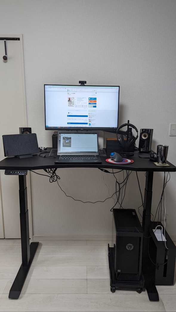 ずっと座っていると腰が痛くなってくるため、電動昇降デスクで立ち・座りを切り替えています。オフィスではキーボードは「REALFORCE R3」を使用していますが、自宅ではノートPCをそのまま使用しています。