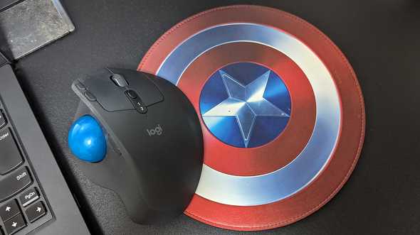 マウス(トラックボール)は「MX ERGO」、マウスパッドはMARVELショップで買ったキャプテン・アメリカの盾です。