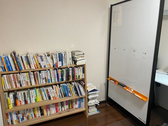 夫はとなりで仕事をしています。夫婦そろって本をよく購入するため、本棚はいっぱいです(夫はIT・人材系の企業の経営)。