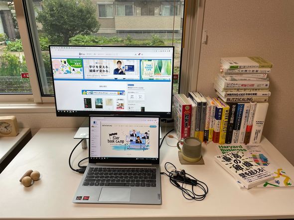普段の作業は目線の高さに置いたモニターで。2つのデータを見比べるときはモニターとノートPCの2画面を使用。本を確認するときは、本を開いたままにできるブックスタンドを活用しています。卓上の本棚には、直近の業務で使う本を並べています。
