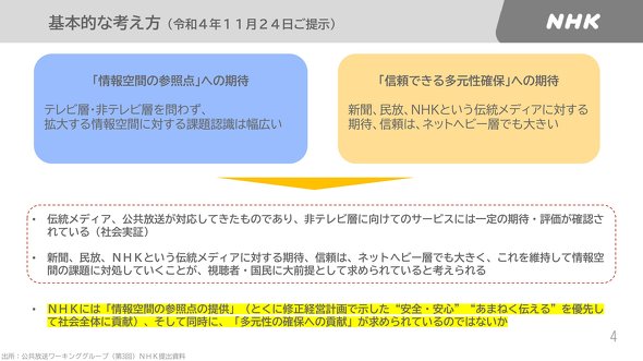 5月26日に開催された第8回では、NHK側が資料を提出し、プレゼンしたようだ。この資料によれば、基本的な考え方として、