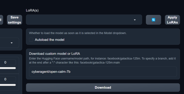続いて、Text Generation web UIの「Model」タブを開き「Download custom model or LoRA」のフィールドに、「cyberagent/open-calm-7b」をペーストします。そして「Download」ボタンを押すと、必要なモデルがHugging Faceからダウンロードされます。ダウンロードが完了したら、「Model」名から「cyberagent/open-calm-7b」を選択し「Load」を押します。これだけでモデルの準備も整いました。