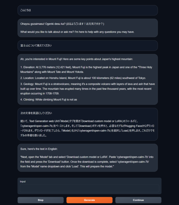 Llama-2-13B-chat-GGMLは、サイズは13Bとかなり小さいのですが、それでもちゃんと対話が成り立っています。ところどころに日本語が登場しているのも、なかなかです。