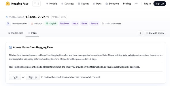 では本丸のLlama2に進みましょう。Llama 2もHugging Faceからダウンロードできますが、ライセンス条項への同意と使用許可ポリシーへの同意が必要です。MetaのWebサイトでの登録のほか、同じメールアドレスでHugging Faceにログインする必要があります。数日以内に確認が終わり、Metaからメールが来たら、モデルがダウンロードできるようになります。