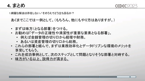 データ分析担当を任された人に対して、戸崎さんは社内での「味方づくり」を提案する。経理や財務、総務といった「データの正確性や清潔性が重要となる部署」のデータ分析を支援し、それを成功事例とすることで、社内でのデータ活用の機運が高まり、本丸の事業部へもスムーズに展開できるという。