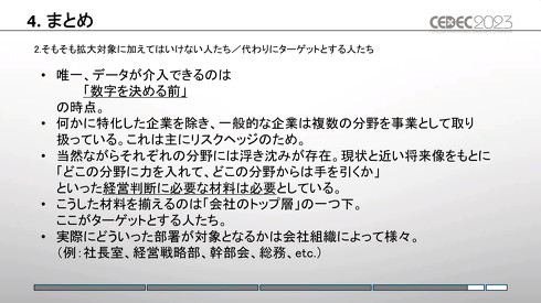 また、社内でデータ活用を推進していく上で、“巻き込んではいけない人”も挙げられた。それは「経営層」だ。戸崎さんは「彼らは、最初に数字ありきで物事を考える人たちで、各部門に数字を割り当てるのが仕事。唯一データが介入できるのは“数字を決める前”であるため、割り当て時点でデータを並べても意味がない」と指摘。