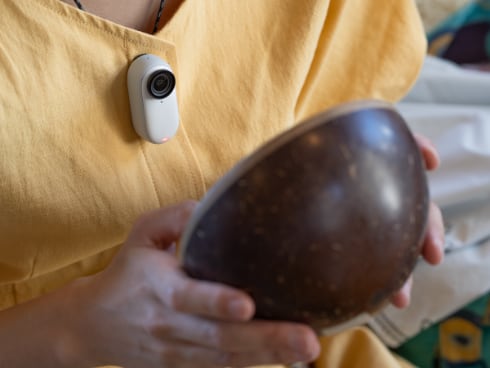 もうひとつ、お馴染みのクリップ。帽子のつばやポケットや、このように肩に掛けたバッグのストラップにつけてもいい。斜め掛けのショルダーバッグのストラップにつけても、自動的に水平を保った動画を撮ってくれるので装着はアバウトでいいのだ。