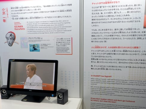 2番目のパネルは、スピードワゴンの小沢一敬さんが、AIと漫才をしようと試みる映像。「小沢さんはNHKで言葉を扱う番組のMCをされていたりもしますが、それ以上に、やっぱり言語センスが優れている方だなと思うんです。小沢さんらしいフレーズというのがすごく明確に世間一般に認知されている方ですし、それが人を笑わせる、面白がらせるというところにつながる暗黙知みたいなものを、小沢さんなら言語化してくれるんじゃないかと期待しました。どこまで深く考えられているのか、ミステリアスなところも魅力ですよね」と佐久間さんは、小沢さんを選んだ理由を話してくれた。