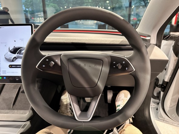 内装でまず驚いたのは、ハンドル左のウインカーレバーと右のシフトレバーがなくなっている点。ウインカーは、左側ハンドルスポークの「←/→」ボタンで操作する。ハンドルを切っている最中は押しにくそう。将来の自動運転を先取りした仕様なのだろうか。ヘッドライト印のボタンはハイビーム用。単なるタッチセンサーではなく、PCのトラックパッドのように感圧式でクリック感がある。