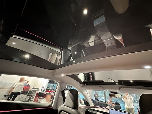 Model Yとは異なり、梁(はり)はあるものの、後席の特権ともいえるガラスルーフの開放感は従来通り。また、旧型では1枚ものだった後席側ウィンドウが合わせガラスになり、遮音性の向上が図られている。