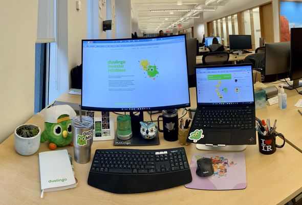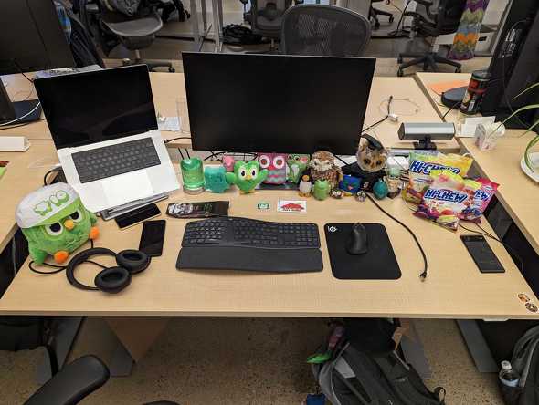 自分の仕事に誇りを持てるよう、職場の雰囲気を作ることはとても大切なことです。デスクでは、花と岩塩ランプ(岩塩をランプ状に加工したもの)で雰囲気を演出しています。また、デュオにDuolingo10周年を記念した帽子を被せて飾っています。