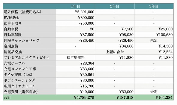 車両そのものや点検等に費やしたコストを総括しましょう。次の表をご覧ください。納車時から3年目を迎えたこれまでのModel 3に投じた経費の内訳です。この他にも、日よけシュードやペット用のシートカバーなど個別事例的な出費はありますが、それは除外しています。