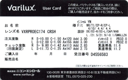 レンズを購入すると、このような購入したレンズに関するデータが書かれたカードが渡される。このカードがあれば、同じ設計のレンズを作る際、検眼は必要なくなる。もちろん、フレームのフィッティングなどは、フレームが変われば別途必要になる。それにしても筆者の目、裸眼だとほとんど見えていないなそういった実際の使用感を含め、Varilux XRシリーズは、一体何がすごいのかについて、出来るだけ具体的に書いてみたのだけど、眼鏡のレンズというのは、本当のところでは実際に体験してみないと分からないものだ。特に、今回のレンズは、徹底的に個人の目に合わせてパーソナライズして完成する製品なので、どのくらい伝わるか、あまり自信がない。