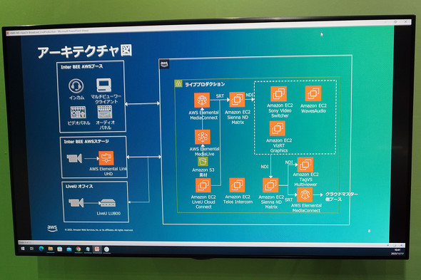 系統図を見ると、SRTとCDIの混在型となっている。CDIはAWSが開発した非圧縮映像信号をクラウドサービス間で受け渡していく技術で、Cloud Digital Interfaceの略称だ。旧来使われてきたSDI(Serial Digital Interface)を意識したネーミングであるという。