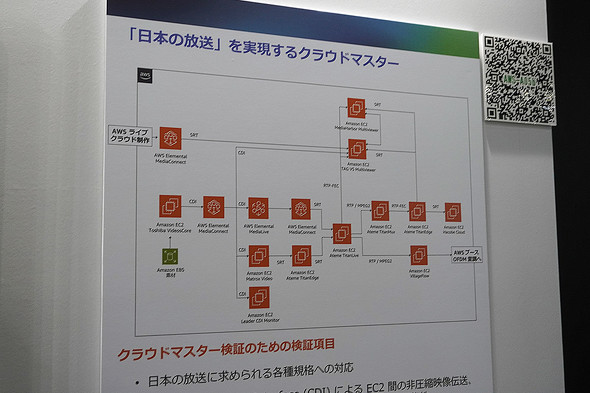 ブースの目玉ともいえる展示が、クラウドを使ったマスターシステムである。ARIB準拠のマスターからの出力を、実際にTSストリームに変調して民生用テレビに出すというところまでシステムが組んであった。
