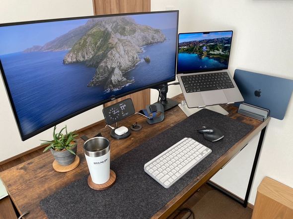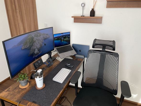 ペライチでフロントエンドエンジニアをしています。デスクの上はなるべく整理しつつ、使わないものは卓上に出さないよう気をつけています。携帯をいじらないよう、充電器で浮かせて時計代わりにしています。エンジニアという職種柄いろいろアプリを立ち上げるので、ウルトラワイドモニターにして作業がしやすい環境を目指してます。お気に入りはGROVEMADEというメーカーの、ウール生地でできたデスクマットです。