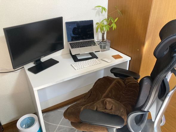 ペライチのバックエンドをメインに担当しているエンジニアです。あまり作業環境にはこだわらない方で、キーボードやマウス等の周辺機器は使用していません。デスクは高さがあるほうが好みなのですが、昇降機能のついているものではなくIKEAの高さを調整できる脚を天板に取り付けるタイプのものを使用して通常よりも高めにしています。腰痛持ちのため椅子は奮発して、値上げ前に滑り込みでエルゴヒューマン製のものを購入しました。かわいいもの好きなので小物が多めです。