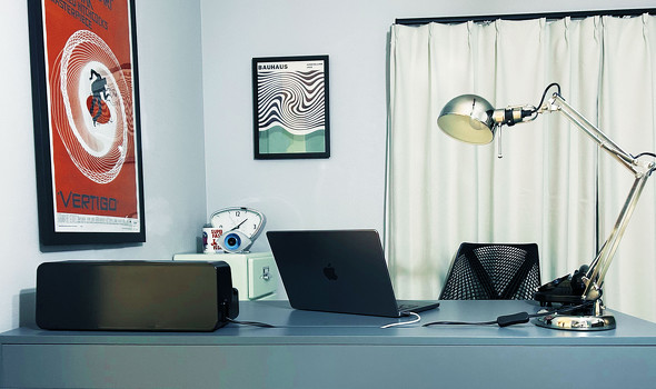 アプリ事業の制作サポート、デザイン、UI作成を担当しています。リモート勤務で集中できるよう専用の作業環境を構築しました。見た目がすっきりしている方がモチベーションが上がるので、なるべくコードをまとめ見えないように配線を工夫しています。ブルーグレーのデスクはIKEAで購入。他にない色ながら電源タップ収納など実用面でも優れものなのでお気に入りです。