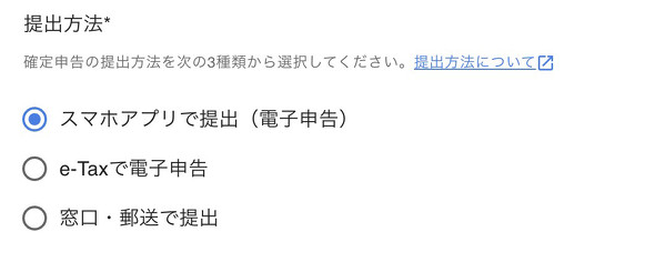 いくつか紛らわしいところがあったので解説していきたい。まず「提出方法」について、「スマホアプリで提出(電子申告)」「e-Taxで電子申告」「窓口・郵送で提出」の3種類が選べるが、これはスマホアプリでもe-Taxでも、青色申告の65万円控除の対象になる。e-Tax=電子申告なのだが、用語が紛らわしい。