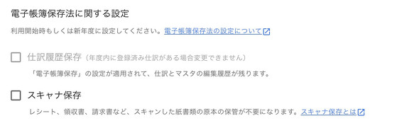続いてややこしいのが「電子帳簿保存法に関する設定」だ。「仕訳履歴保存」と「スキャナ保存」にチェックを入れることができる。画面のヘルプを読んでもどうしたらいいのか分からず途方にくれるが、結論からいうとこれはどちらもチェックなしでOKだ。