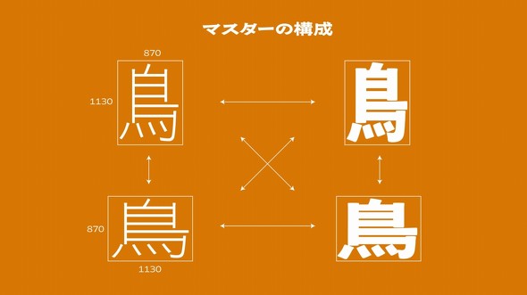 バリアブルフォントでは、4つの可変軸が持てる。これをどう使うかが、ポイントになる。西塚氏のアプローチは、フォントのマスターデザインとして、まず4隅を定義した。縦長の細いもの、縦長の太いもの、横長の細いもの、横長の太いもの、である。これが相互に、いわゆるモーフィングのような格好でバリアブルに中間状態が作れる。