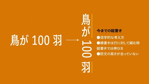 もう1つのポイントは、縦書きに対する考え方が変わることである。例えば横書きの時に、行に対して圧縮すると、文字は縦長になる。一方で縦書きの場合、行に対して圧縮すれば、各文字は横に潰れなければならないはずが、横書き同様に文字が縦長になる。つまり文字1個1個の形を見ればどちらも同じ動きにはなるわけだが、「行を縮めたい」という狙いは、縦書きでは逆になってしまう。