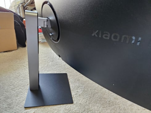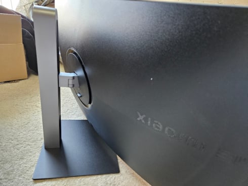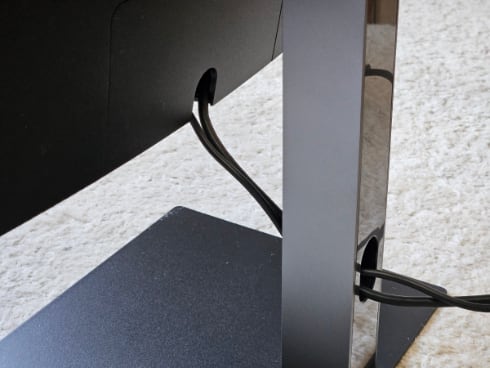 組み立ては簡単でした。脚の下の方にある穴にケーブルを通すときれいにまとまります。またディスプレイの高さ調整はけっこう幅があり、これならアームなしでも、自分の好きな高さに調整できそうです。