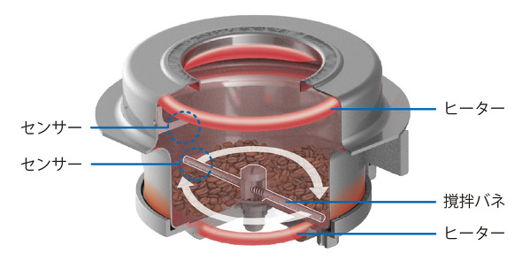 ダイニチ工業の焙煎機能の特徴は、上下から熱を加えるダブルヒーターの採用だ。このダブル焙煎方式の採用によりムラなく焙煎できる。さらにセンサーが豆の温度を検知し、きめ細かく制御することで、電気ヒーター直火式ながら均一の仕上りを実現するのだ。