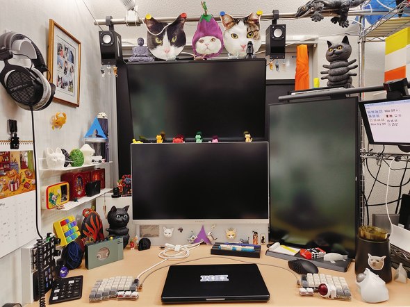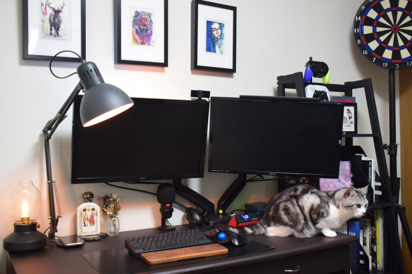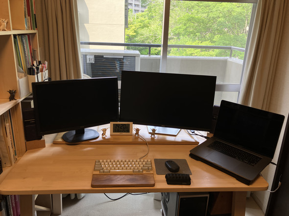 お気に入りのキーボード(HHKB)とトラックボールを使っています。ノートパソコンで業務をしていますが普段は閉じて二枚のモニターに映し使っています。デスクライトはAlexaを使って声で操作できるようにし、机の上はできるだけものを出さずに集中できるようにしています。たまに猫がやってきます。