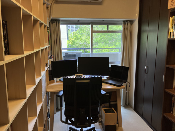 この本棚が気に入ったので机やゴミ箱もそれに合わせて新調して統一感を出しました。窓からは街路樹が見えます。春は桜、夏は青々とした緑、そして秋は紅葉を眺めながら仕事しています。